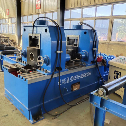 HTJZ-60C 鋼結構液壓矯正機主要是矯正H型鋼焊接后變形的翼板。其主傳動采用15kw的電機及擺線針輪雙級減速傳動,傳動效率高,輸出扭矩大,矯正速度快。矯正孔型調整采用液壓上壓式結構,傳輸力矩大,運行平穩,調整方便。所有的矯正輥均采用優質合金鋼鍛打而成、進行整體熱處理,避免了該零件容易產生裂紋的缺陷。矯正原理是利用上輥裝置和傳動輥構成杠桿原理的孔型,使被矯翼緣通過該孔型,產生過彎曲變型,經過彈性恢復達到所要求的矯正形狀,從而實現對工字鋼翼緣進行連續矯正達到質量標準。