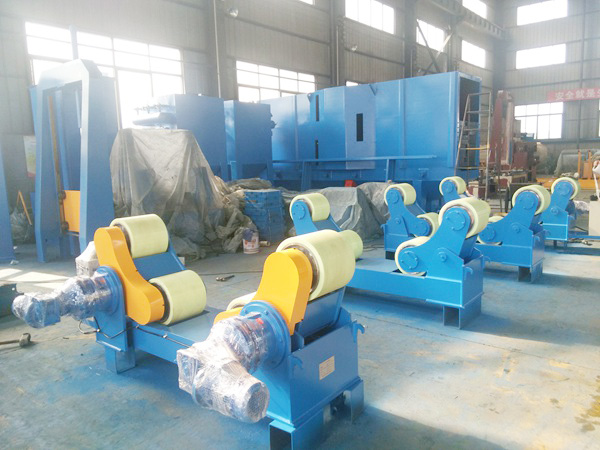 2、主動(被動)滾輪架底座上分別安裝有兩組能轉動一定角度的滾輪裝置,兩組滾輪裝置能夠繞其心軸轉動一定角度,故隨工件規格大小能自動調整從而保證工件旋轉時平穩,連續。